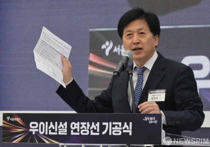 [서울=뉴스핌] 양윤모 기자 = 오기형 더불어민주당 국회의원이 24일 오전 서울 도봉구 방학동 방학사계광장 여름마당에서 개최된 '우이신설 연장선 기공식'에 참석 빠른 착공을 주문하고 있다. 우이신설 연장선 사업은 2032년 개통을 목표로 솔밭공원역에서 1호선 방학역까지 총 3.93km, 3개 정거장 신설을 목표로 총사업비 4,690억 원이 투입되는 도봉구 방학·쌍문 지역의 교통 편의 증진과 지역 발전을 위한 대형 교통망 사업으로 시공사는 ‘HL디앤아이한라 컨소시엄’이다. 행사에는 오세훈 서울시장,최호정 서울시의회 의장,오언석 도봉구청장,오기형 더불어민주당 국회의원 등이 참석했다. 2025.11.24 yym58@newspim.com