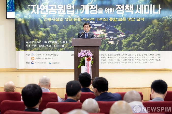 [서울=뉴스핌] 김성환 기후에너지환경부 장관이 24일 서울 영등포구 국회 의원회관에서 열린 자연공원법 개정을 위한 정책 세미나에 참석해 축사를 하고 있다. [사진=기후에너지환경부] 2025.11.24 photo@newspim.com