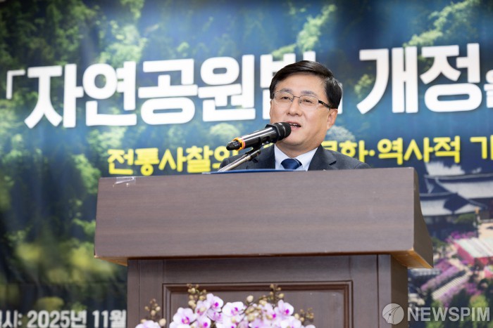 [서울=뉴스핌] 김성환 기후에너지환경부 장관이 24일 서울 영등포구 국회 의원회관에서 열린 자연공원법 개정을 위한 정책 세미나에 참석해 축사를 하고 있다. [사진=기후에너지환경부] 2025.11.24 photo@newspim.com