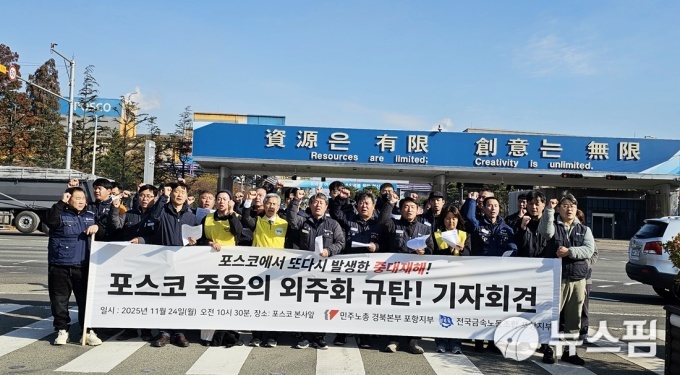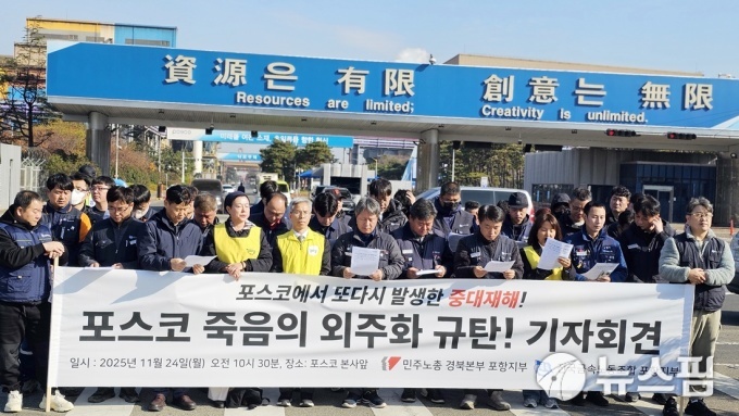 민주노총 경북본부 포항지부와 전국금속노조 포항지부가 24일 포항시 남구 포스코 포항제철소 정문 앞에서 '포스코 포항제철 스테인리스 4제강공장 일산화탄소 질식 중대 재해' 관련 기자회견을 열고 "철저한 수사와 안전 의무를 위반한 경영 책임자 처벌"를 촉구하고 있다.[사진=독자제공]2025.11.24 nulcheon@newspim.com