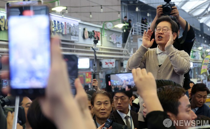 | '골목골목 경청투어'에 나선 이재명 더불어민주당 대선후보가 9일 오후 경북 성주군 성주전통시장에서 즉흥연설을 하고 있다. 2025.05.09 choipix16@newspim.com |