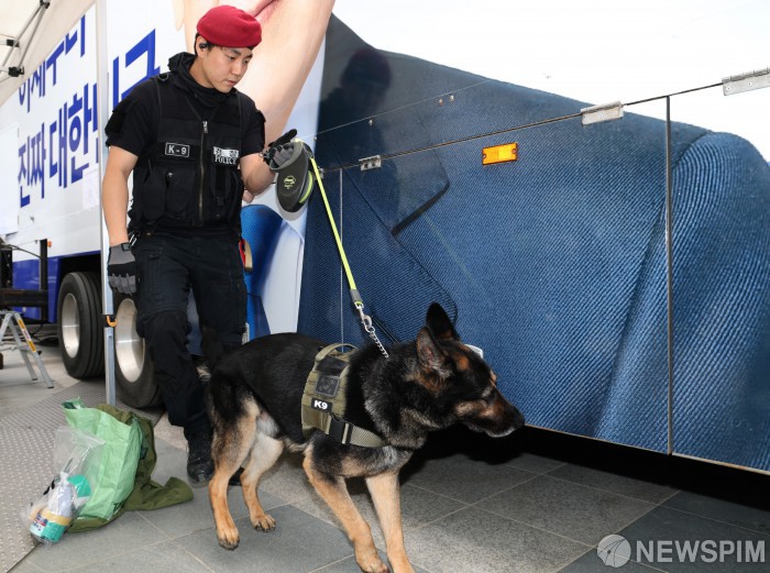 | 19일 오후 서울 용산역 광장에서 이재명 더불어민주당 대통령 후보의 집중유세가 예정된 가운데 폭발물 탐지견이 유세 현장을 살피고 있다. 2025.05.19 pangbin@newspim.com |