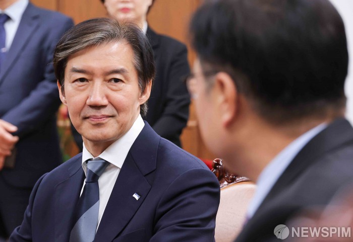[서울=뉴스핌] 윤창빈 기자 = 조국 조국혁신당 대표가 25일 서울 여의도 국회에서 당대표 취임 인사 차 우원식 국회의장을 예방한 가운데 발언을 경청하고 있다. 2025.11.25 pangbin@newspim.com