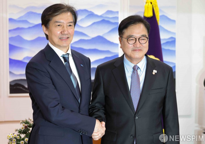 [서울=뉴스핌] 윤창빈 기자 = 우원식 국회의장이 25일 서울 여의도 국회에서 당대표 취임 인사 차 예방한 조국 조국혁신당 대표와 기념촬영을 하고 있다.2025.11.25 pangbin@newspim.com