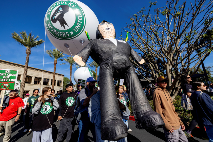 스타벅스 바리스타들이 임금 인상과 복리후생 개선을 요구하며 시위를 벌이고 있다. 사진은 현지시간 2025년 11월24일 미국 캘리포니아주 뉴포트 비치를 행진하는 시위대의 모습. 스타벅스 로고의 '세이렌(유혹의 바다 신)' 대신 스타벅스 컵을 쥔 주먹으로 저항과 단결의 '망치' 이미지를 형상화했다. 스타벅스 노조는 11월13일부터 무기한 파업에 들어갔다.