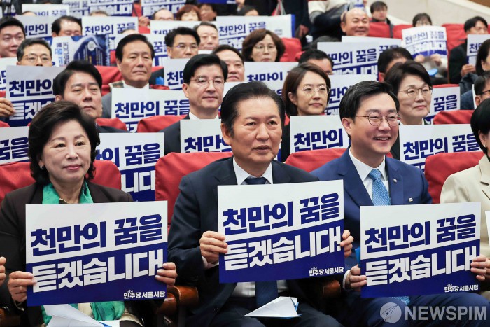 [서울=뉴스핌] 윤창빈 기자 = 정청래 더불어민주당 대표를 비롯한 서울시당 및 참석자들이 25일 서울 여의도 국회 의원회관에서 열린 민주당 서울시당 '천만의 꿈 경청단' 출범식에서 피켓을 들고 구호를 외치고 있다. 2025.11.25 pangbin@newspim.com