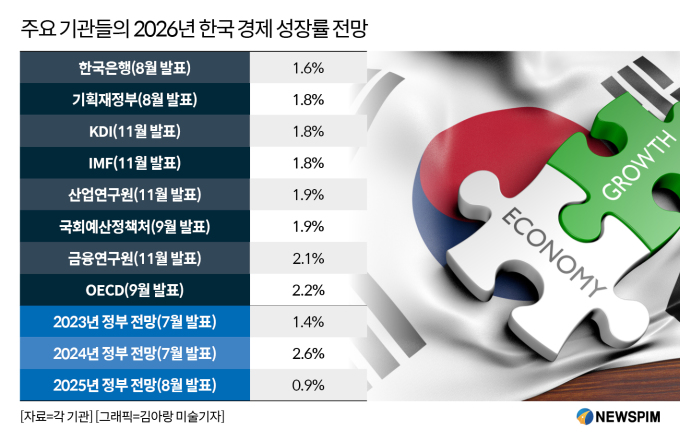 반면 한국은행은 1.6%로 가장 낮은 전망치를 유지했다. 경제협력개발기구(OECD)는 2.2%, 한국금융연구원은 2.1%를 각각 제시하며 상대적으로 낙관적인 전망을 내놨다.
