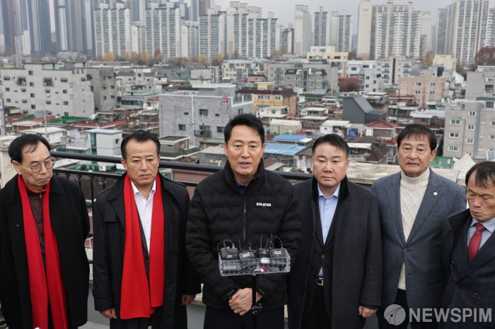 [서울=뉴스핌] 양윤모 기자 = 오세훈 서울시장이 25일 오전 서울 중랑구 중화동 중화마중마을활력소 옥상에서 329-38번지 일대 중화동 모아타운사업 추진현황을 설명하고 있다.중랑구 중화동 일대 모아타운은 4개 사업지에서 총 2295가구(임대 453가구)가 공급되며 사업지는 세입자가 이사할 때 이주비 등을 지원하고 용적률을 추가로 확보하는 '세입자 손실보상' 제도가 적용된다. 2025.11.25 yym58@newspim.com