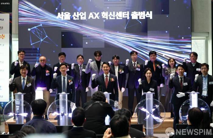 [서울=뉴스핌] 최지환 기자 = 오세훈 서울시장이 25일 오후 서울 서초구 서울 AI허브 메인센터에서 열린 서울산업AX혁신센터 출범식에서 최호정 서울시의회 의장을 비롯한 참석자들과 세레머니를 하고 있다. 2025.11.25 choipix16@newspim.com