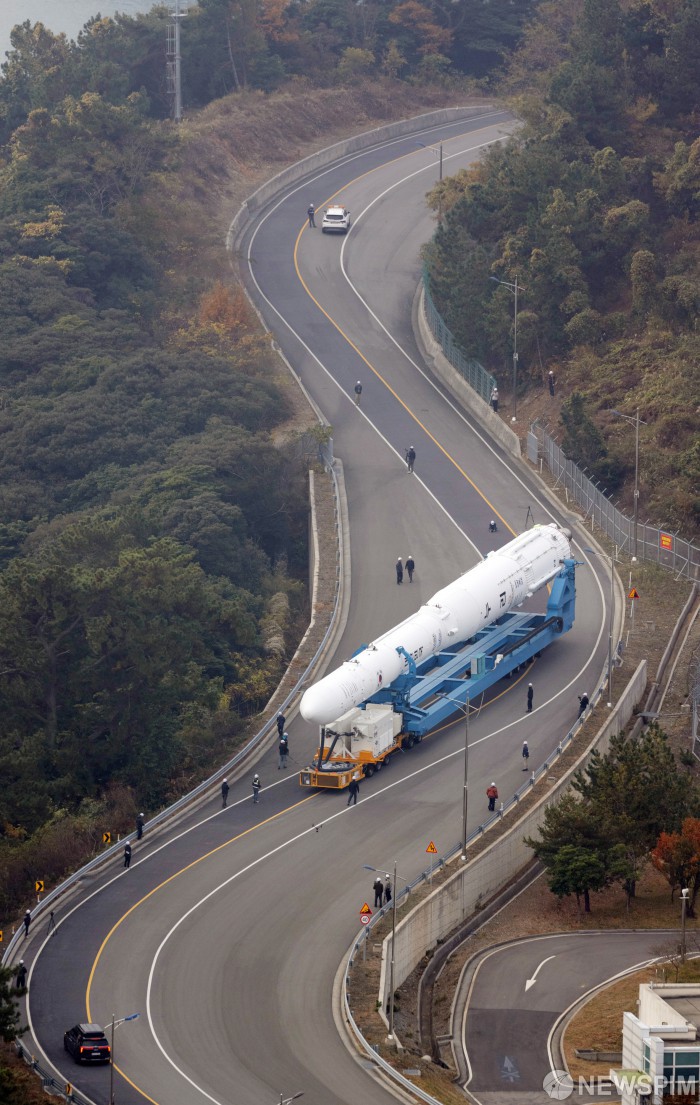 [서울=뉴스핌] 25일 전남 고흥 나로우주센터에서 누리호가 발사대로 이동하고 있다. [사진=한국항공우주연구원] 2025.11.25 photo@newspim.com