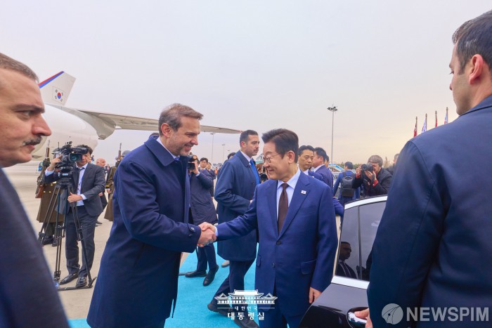 [서울=뉴스핌] 이재명 대통령이 지난 24일(현지시간) 튀르키예 앙카라 국제공항에 도착해 관계자와 악수를 하고 있다. [사진=대통령실] 2025.11.26 photo@newspim.com