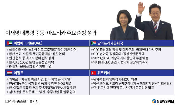 이 대통령은 이날 오전 서울공항에 도착했다. 아랍에미리트(UAE), 이집트, 남아프리카공화국, 튀르키예를 다녀온 이 대통령은 당분간 국내 현안에 집중할 것으로 보인다.