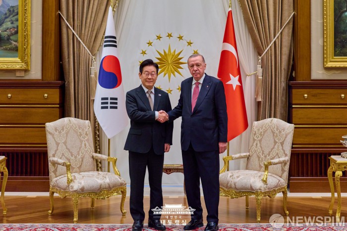 [서울=뉴스핌] 이재명 대통령과 레제프 타이이프 에르도안 튀르키예 대통령이 지난 24일(현지시간) 튀르키예 앙카라 대통령궁에서 한-튀르키예 첫 정상회담을 앞두고 악수를 하고 있다. [사진=대통령실] 2025.11.26 photo@newspim.com