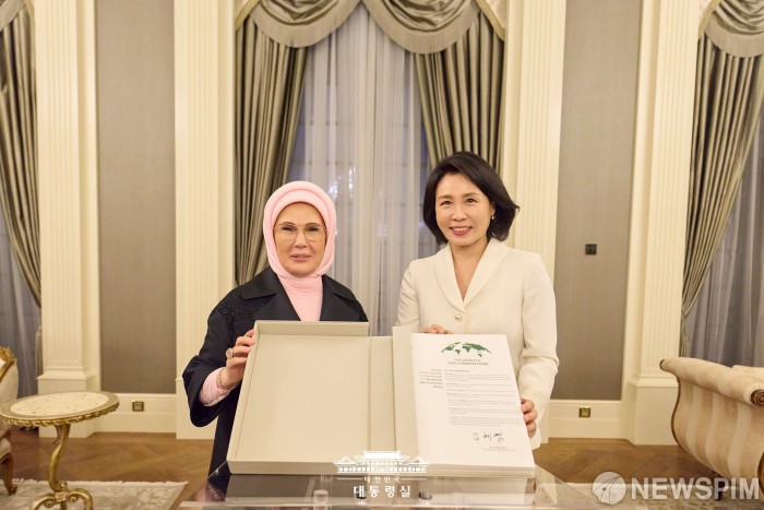 [서울=뉴스핌] 김혜경 여사가 튀르키예 대통령 부인 에미네 에르도안 여사와 함께 지난 24일(현지시간) 오후 대통령궁에서 제로 웨이스트(Zero Waste) 이니셔티브에 동의 서명하고 있다. 제로 웨이스트는 2017년 에르도안 여사가 제안해 2022년 유엔(UN)에서 결의된 폐기물 감축·재활용 촉진 이니셔티브 운동이다. [사진=대통령실] 2025.11.26 photo@newspim.com