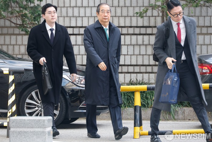 [서울=뉴스핌] 류기찬 기자 = 한덕수 전 국무총리가 26일 오전 서울 서초구 서울중앙지법에서 열린 내란 방조 및 내란 중요임무 종사 혐의 관련 결심공판에 출석하고 있다. 2025.11.26 ryuchan0925@newspim.com