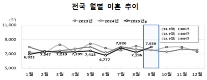 9월 이혼 건수는 7959건으로 전년 동월 대비 429건(5.7%) 증가했다.