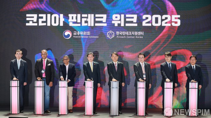 [서울=뉴스핌] 김학선 기자 = 이억원 금융위원장과 윤한홍 국회 정무위원장을 비롯해 주요 내빈들이 26일 서울 양재 aT센터에서 열린 '제7회 코리아 핀테크 위크 2025'에서 개막 퍼포먼스를 하고 있다. 올해는 'K-핀테크 30 선정식'을 비롯해 세미나·부대행사 등 다양한 프로그램으로 구성돼 최대 규모로 진행된다. 2025.11.26 yooksa@newspim.com