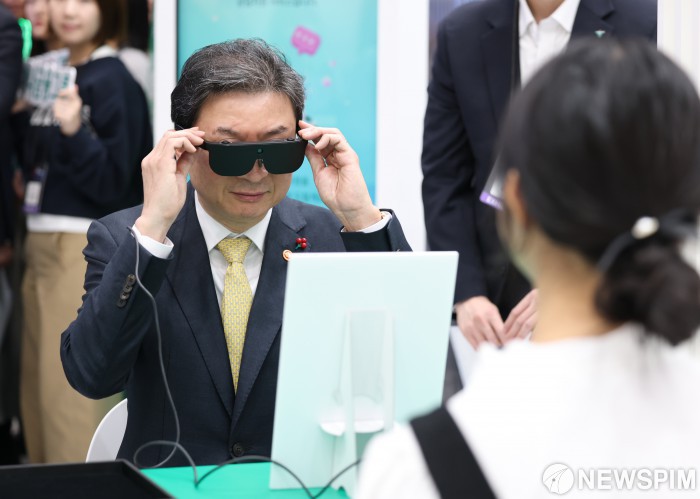 [서울=뉴스핌] 김학선 기자 = 이억원 금융위원장이 26일 오전 서울 서초구 aT센터에서 열린 '코리아 핀테크 위크 2025' 하나금융 부스에서 AI 안경을 착용한 채 금융 상품 설명을 듣고 있다. 2025.11.26 yooksa@newspim.com