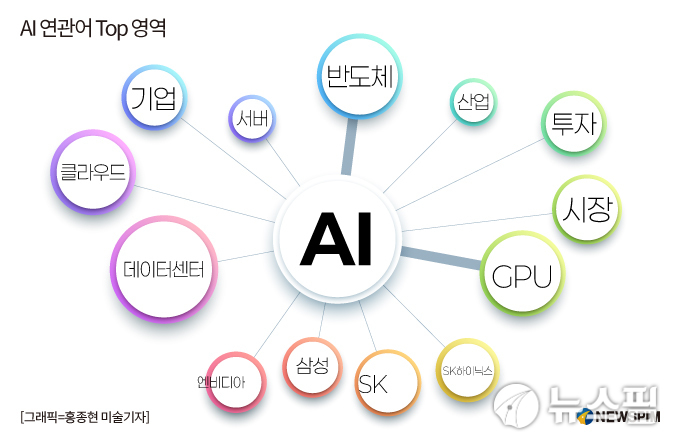 '엔비디아(1만7571건)', '삼성(1만8455건)', 'SK(1만0184건)', 'SK하이닉스(6241건)' 등 기업명 역시 주요 연관어로 등장한다.