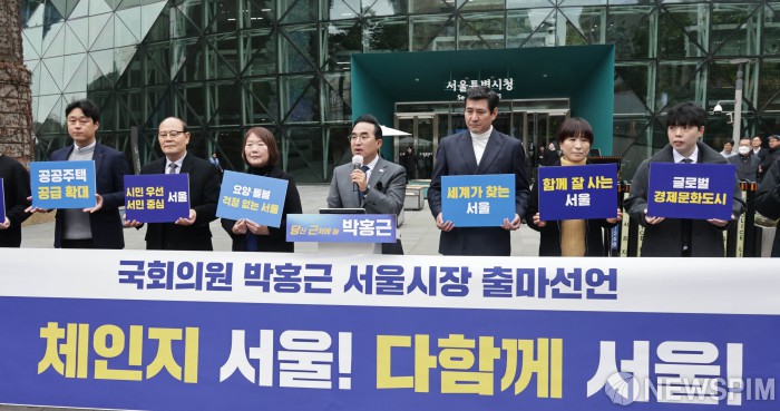 [서울=뉴스핌] 양윤모 기자 = 박홍근 더불어민주당 의원이 26일 오후 서울시청 앞에서 내년 6월 3일 치러지는 서울시장 출마를 선언하고 있다. 더불어민주당 원내대표를 역임한 4선 중진 박홍근 의원은 민주당 내 서울시장 출마를 가장 먼저 공식화 했다. 이 자리에서 박 의원은 현 서울시정의 문제를 3불(불안정·불균형·불평등)로 규정하고, '서울의 성장 동력 제고 방안' 등을 제시했다. 2025.11.26 yym58@newspim.com
