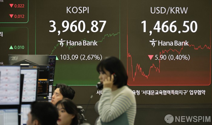 [서울=뉴스핌] 양윤모 기자 = 26일 오후 코스피가 전장 종가보다 103.09 포인트(2.67%) 상승하며 3960.87로, 코스닥은 21.29 포인트(2.49%) 상승한 877.32로 장을 마감한 가운데, 서울 중구 하나은행 딜링룸에서 직원들이 업무를 보고 있다. 서울외환시장에서 달러/원 환율은 전장 대비 5.90원 하락한 1466.50원에 주간거래를 마감했다. 2025.11.26 yym58@newspim.com