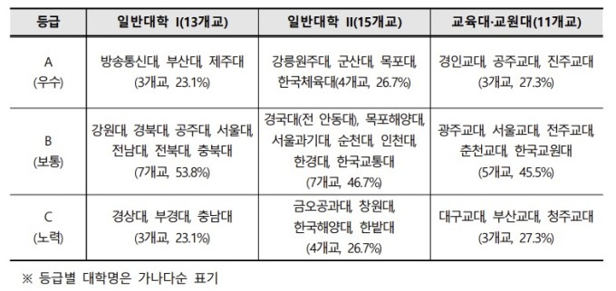 국립대(37개교) 및 국립대법인(2개교) 총 39개교를 전임교원 수에 따라 일반대 I(13개교), 일반대 II(15개교), 교육대·교원대(11개교)로 분류해 점검을 실시했다.