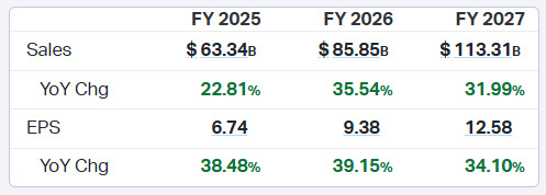 코이핀이 집계한 애널리스트 컨센서스에 따르면 '25회계연도(작년 11월~올해 10월) 연간 매출액은 633억4000만달러로 23%의 증가폭이 예상되는 한편 '26회계연도와 '27회계연도는 각각 36%와 32% 증가율이 전망된다. 주당순이익은 '25회계연도 38%, '26회계연도와 '27회계연도는 각각 39%와 34%다.