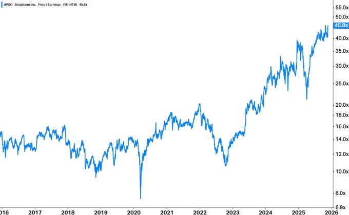 브로드컴의 주가수익배율(PER, 포워드) 10년 추이 [자료=코이핀]