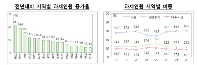 기재부 관계자는 "주택분 종합부동산세 과세인원이 모든 지역에서 증가했다"며 "공시가격이 상대적으로 크게 상승한 수도권의 증가율이 더 높게 나타났다"고 설명했다.