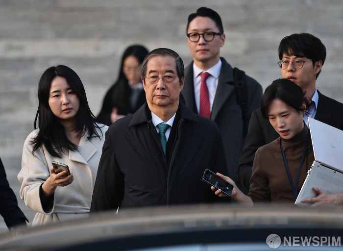 [서울=뉴스핌] 류기찬 기자 = 한덕수 전 국무총리가 26일 오후 서울 서초구 서울중앙지법에서 열린 내란 방조 및 내란 중요임무 종사 혐의 관련 결심공판을 마친 뒤 법원을 나서고 있다. 2025.11.26 ryuchan0925@newspim.com