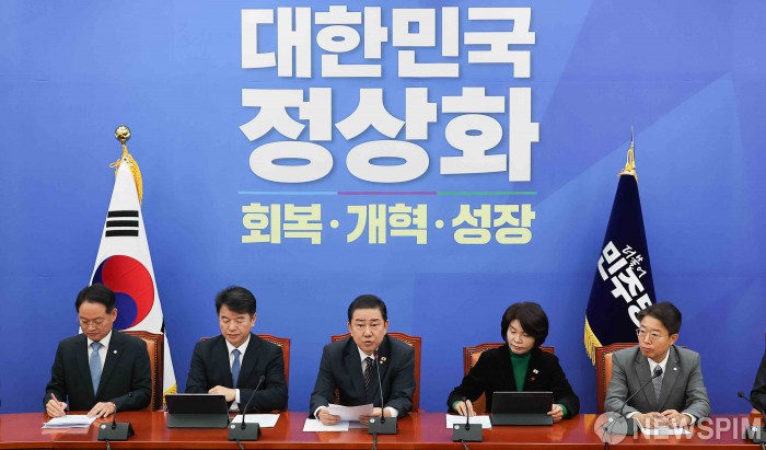 [서울=뉴스핌] 윤창빈 기자 = 김병기 더불어민주당 원내대표가 27일 서울 여의도 국회에서 열린 정책조정회의에서 모두발언을 하고 있다. 2025.11.27 pangbin@newspim.com
