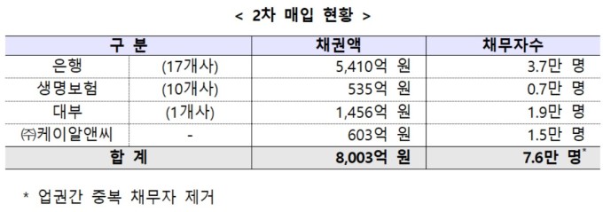2차 매입대상 채권은 7년 이상 연체, 5000만 원 이하의 개인(개인사업자 포함) 무담보채권으로 총 규모는 약 7만6000명이 보유한 약 8000억 원이다. 지난 1차 매입은 10월 30일로 한국자산관리공사가 22만9000명이 보유한 3조7000억원 규모였고, 국민행복기금이 11만1000명이 보유한 1조7000억원이었다.