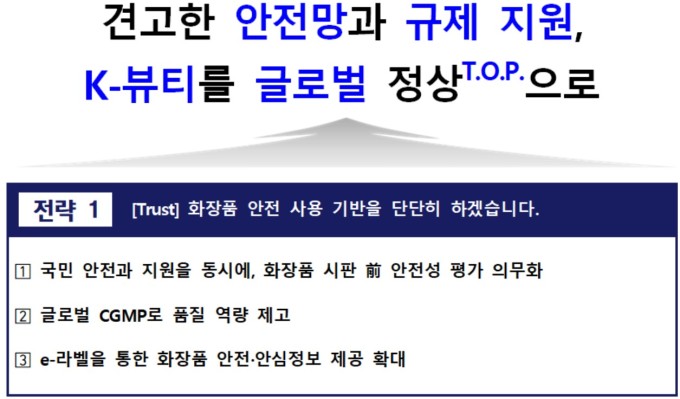 식약처는 화장품의 안전을 강화하고 규제 협력으로 세계 진출을 지원하기 위해 3가지 전략을 마련했다. 우선 화장품 안전 사용 기반을 단단히 하기 위해 내년부터 화장품 시판 전 안전성 평가를 의무화한다. 업체는 화장품이 인체에 안전함을 입증하기 위해 자체 평가를 해야 한다.
