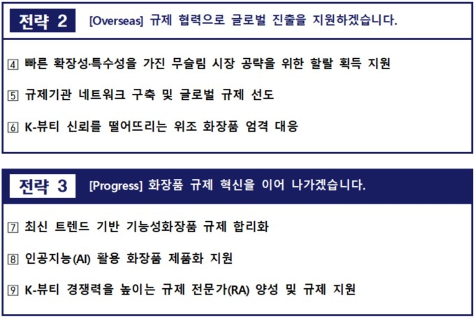 신흥 수출국 규제당국을 초청하는 '글로벌 화장품 규제혁신 포럼'과 양자협력·양해각서(MOU) 체결 등을 통해 규제 협력 네크워크 구축도 강화한다. 해외 법령, 수출안내서, 인허가 교육 등을 제공하는 온라인 플랫폼 '화장품 글로벌 규제조화 지원센터'도 확대한다.
