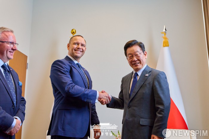 [서울=뉴스핌] 이재명 대통령과 카롤 나브로츠키 폴란드 대통령이 지난 24일(현지시간) 미국 뉴욕 유엔본부에서 정상회담을 앞두고 기념 촬영을 하고 있다. [사진=대통령실] 2025.09.26 photo@newspim.com