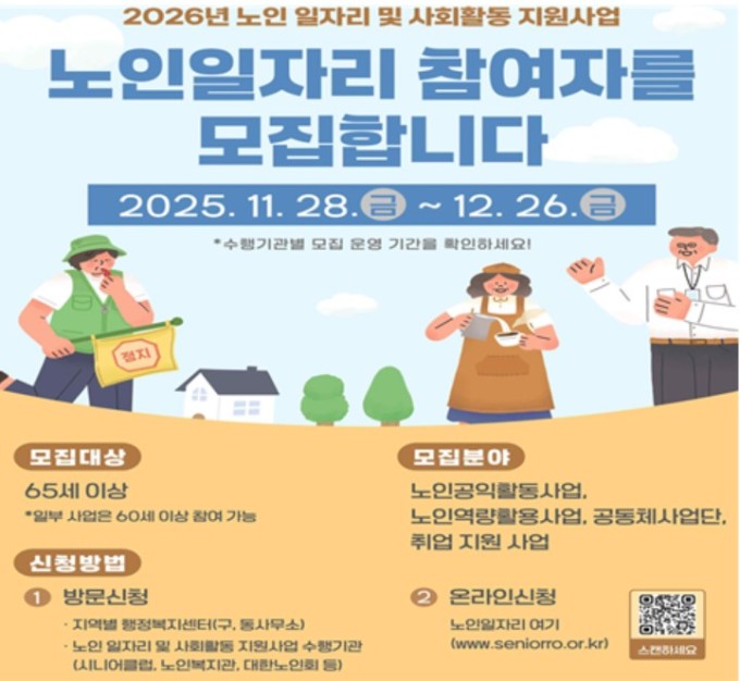 [세종=뉴스핌] 신도경 기자 = 내년도 노인일자리 신청이 오는 28일부터 다음달 26일까지 진행된다.
