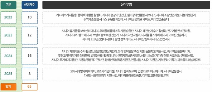 이를 위해 복지부는 노인적햡형 신직무 65개를 선정해 추진한다. 올해는 국가보훈부와 협의해 보훈 시설에 대한 관리를 하는 일자리를 만들었다. 건설 자격증이 있는 사람들이 사회복지 시설 안전점검에 참여하는 일자리도 새롭게 시도한다. 방과 후 학습 활동하는 아동을 돌보는 일자리 등도 포함됐다.