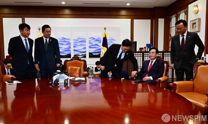 [서울=뉴스핌] 윤창빈 기자 = 우원식 국회의장이 27일 오전 서울 여의도 국회에서 열린 여야 원내대표 회동에 참석해 사진촬영을 거부하는 송언석 국민의힘 원내대표에게 참여를 권하고 있다. 2025.11.27 pangbin@newspim.com