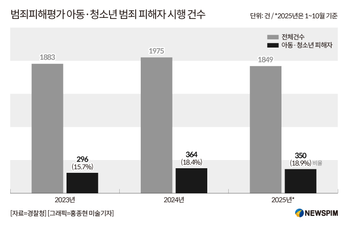 범죄피해평가제도를 시행한 피해자 중에서 아동·청소년 범죄 피해자 비중은 최근 증가세를 보이고 있다. 2023년에는 총 1883건 중 296건으로 15.7%, 지난해에는 총 1975건 중 364건으로 18.4%를 기록했다.