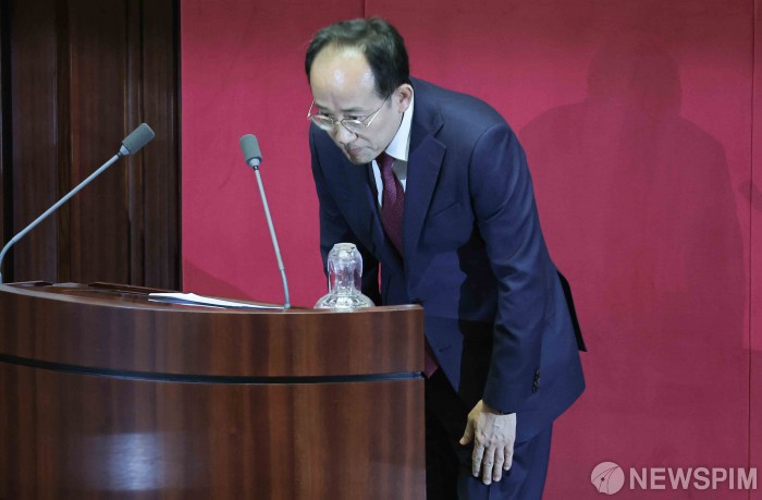 [서울=뉴스핌] 윤창빈 기자 = 추경호 국민의힘 의원이 27일 서울 여의도 국회에서 열린 본회의에서 본인의 체포동의안에 대한 신상발언을 하기 전 인사하고 있다. 2025.11.27 pangbin@newspim.com
