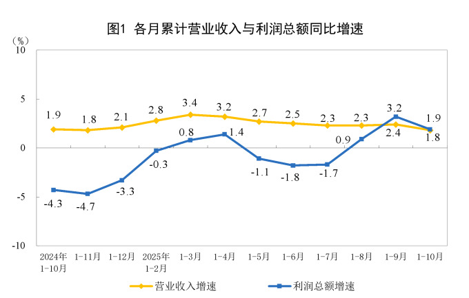 올해 10월까지의 누적 공업 기업의 순이익 합계는 5조 9502억 위안으로 전년 대비 1.9% 증가했다.