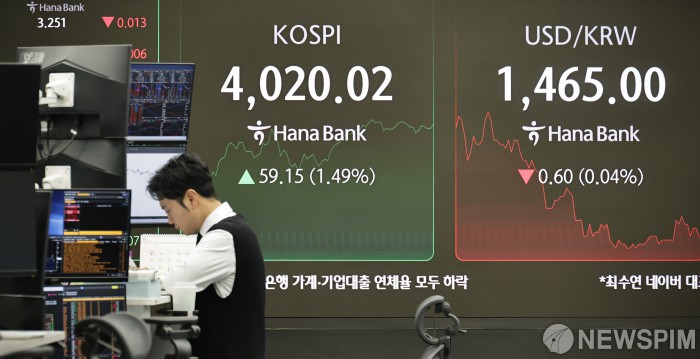 | [서울=뉴스핌] 양윤모 기자 = 뉴욕증시가 AI 기대감으로 3대 지수가 동반 상승 마감한 가운데, 27일 오전 코스피가 전장 종가보다 59.15포인트(1.49%) 상승하며 4020.02로, 코스닥은 4.77 포인트(0.54%) 상승한 882.09으로 장을 시작한 가운데, 서울 중구 하나은행 딜링룸에서 직원들이 업무를 보고 있다. 서울외환시장에서 달러/원 환율은 전장 대비 0.60원 하락한 1465.00원에 주간거래를 시작했다. 2025.11.27 yym58@newspim.com |