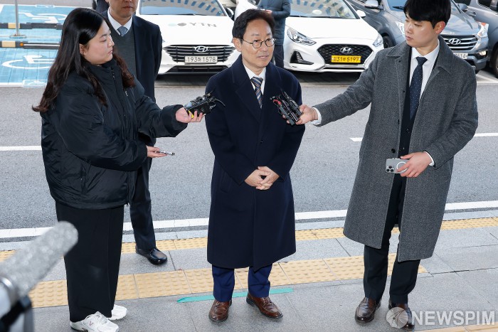 [서울=뉴스핌] 류기찬 기자 = 박범계 더불어민주당 의원이 28일 오전 서울 양천구 서울남부지법에서 열린 패스트트랙 충돌 사건 관련 1심 결심공판에 출석하며 입장을 밝히고 있다. 2025.11.28 ryuchan0925@newspim.com