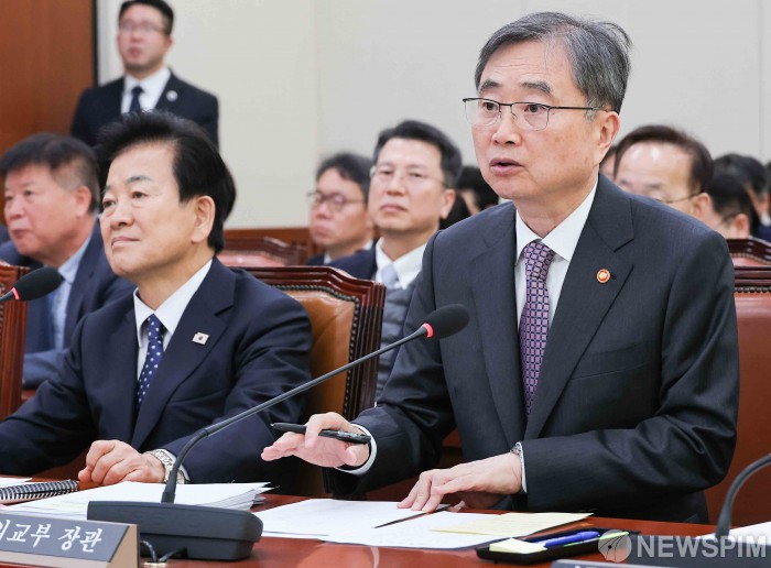 [서울=뉴스핌] 윤창빈 기자 = 조현 외교부 장관이 28일 서울 여의도 국회에서 열린 외교통일위원회 전체회의에서 의원 질문에 답변하고 있다. 2025.11.28 pangbin@newspim.com