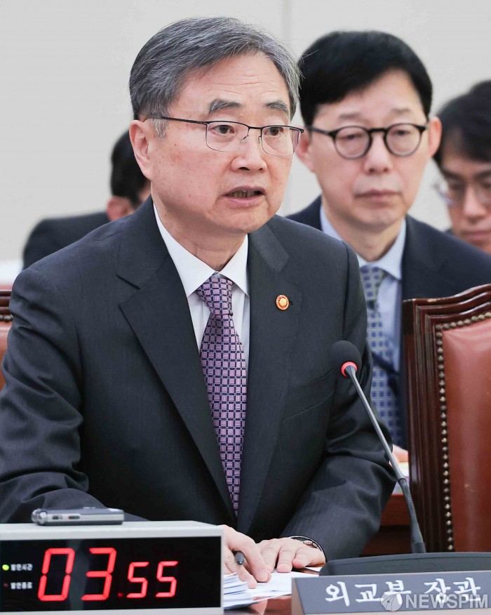 [서울=뉴스핌] 윤창빈 기자 = 조현 외교부 장관이 28일 서울 여의도 국회에서 열린 외교통일위원회 전체회의에서 의원 질문에 답변하고 있다. 2025.11.28 pangbin@newspim.com