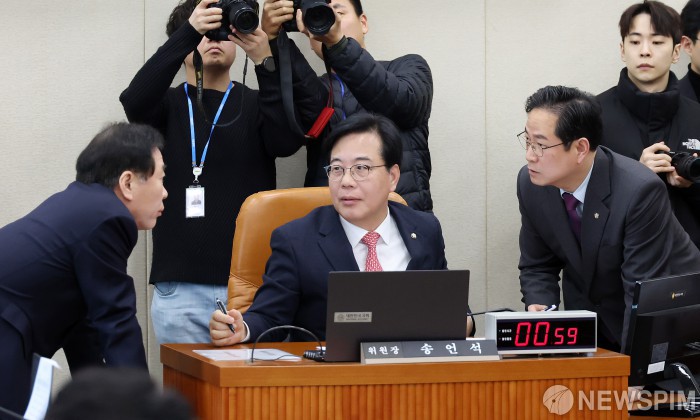 | [서울=뉴스핌] 정일구 기자 = 18일 오전 서울 여의도 국회에서 열린 기획재정위원회 전체회의에서 송언석 위원장(가운데)이 박수영 국민의힘 간사(오른쪽) 와 정태호 더불어민주당 간사와 대화하고 있다. 2025.02.18 mironj19@newspim.com |