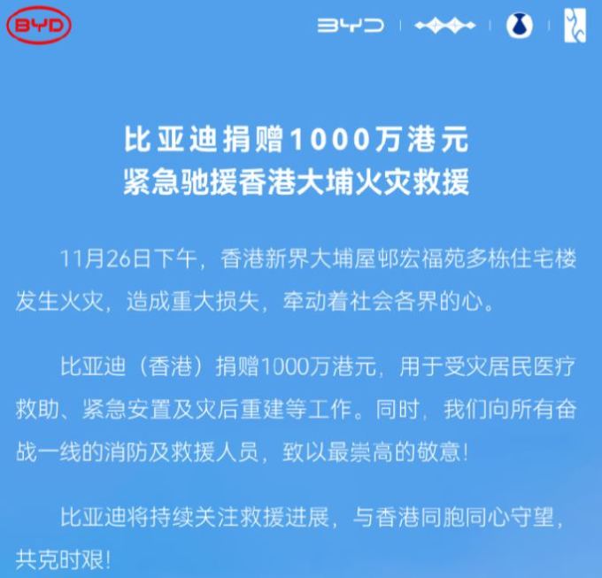 | [사진 = 비야디 공식 웨이보] 비야디(BYD, 002594.SZ/1211.HK)는 홍콩 아파트 대형화재 피해 복구를 위해 1000만 HKD를 기부한다고 밝혔다. |