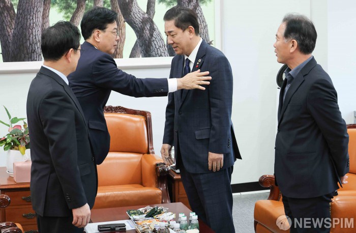 [서울=뉴스핌] 윤창빈 기자 = 송언석 국민의힘 원내대표가 28일 서울 여의도 국회에서 열린 여야 2+2 회동에 앞서 김병기 더불어민주당 원내대표의 옷을 정리해주고 있다. 2025.11.28 pangbin@newspim.com