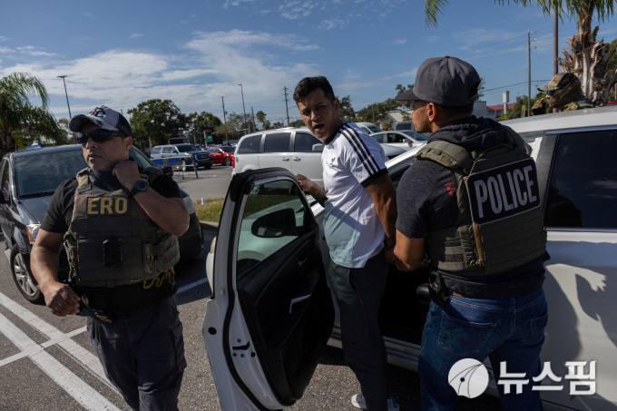 | 미 연방 요원들이 2025년 11월 7일 플로리다주 피넬라스파크의 한 주차장에서 이민 단속 작전 중 한 남성을 체포하고 있다. [사진=로이터 뉴스핌] |