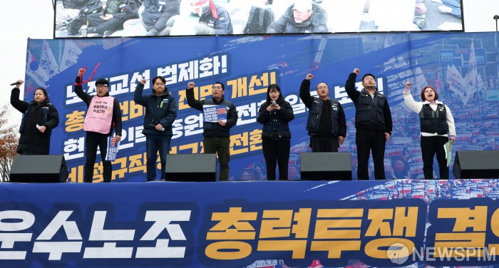 [서울=뉴스핌] 최지환 기자 = 공공운수노조 조합원들이 29일 오후 서울 용산구 대통령실 인근에서 열린 '공공운수노조 총력투쟁 결의대회'에서 구호를 외치고 있다. 2025.11.29 choipix16@newspim.com